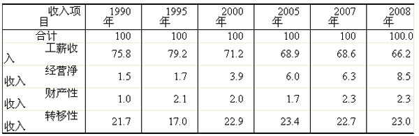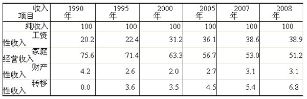 (1)工资性收入不再是收入的绝对主体。中华人民共和国成立后至改革开放前,全国城镇居民就业者中绝大多数为国有和集体职工,就业形式和收入渠道比较单一,工资性收入几乎是收入的唯一来源。改革开放尤其是经济体制的改革为城镇经济注入了活力,也调整了城镇居民收入的内部结构。各种经济类型的企业从无到有,新型职业行业如雨后春笋层出不穷。就业渠道的拓宽使得城镇居民的收入来源逐渐增多,工资性收入不再是城镇居民收入的绝对主体。1978年以来,工资性收入占总收入的比重逐年下降。2008年,城镇居民人均工资性收入11299元,占总收入的比重下降到66.2%,比1949年下降了近24个百分点。