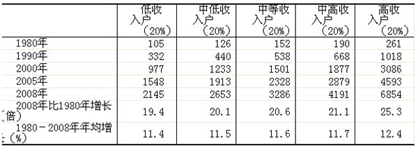 从收入5分组来看农村居民消费水平(未考虑价格因素影响),1980-2008年,尽管不同收入组农村居民消费水平存在差异,但总体上普遍增长较快,年均生活消费增长幅度均超过11%。其中:低收入组1980年的生活消费支出人均105元,到2008年提高到2145元,年均增长11.4%;中等收入组人均生活消费支出由152元提高到3286元,年均增长11.6%;高收入组人均生活消费支出由261元提高到6854元,年均增长12.4%。