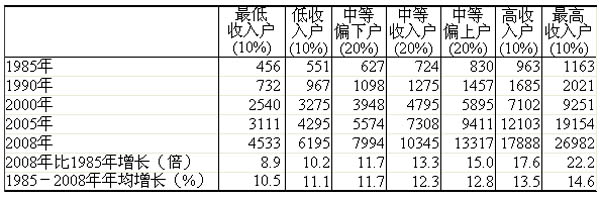 从收入7分组来看城镇居民的消费水平(未考虑价格因素影响),1985-2008年,虽然不同收入组城镇居民消费水平存在差异,但普遍增长较快,每组年均生活消费支出增长幅度均超过10%。其中:最低收入户1985年的生活消费支出人均456元,到2008年提高到4533元,年均增长10.5%;中等收入户人均生活消费支出由724元提高到10345元,年均增长12.3%;最高收入户人均生活消费支出由1163元提高到26982元,年均增长14.6%。