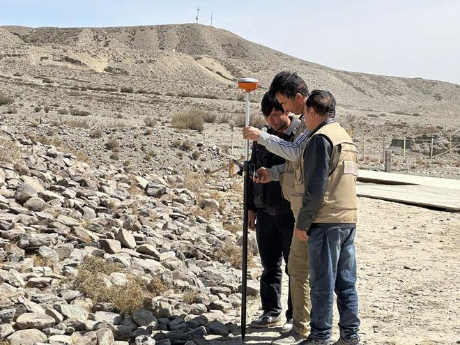乌什县文物普查队队员正在别迭里烽燧使用RTK采集坐标点信息 王思超供图
