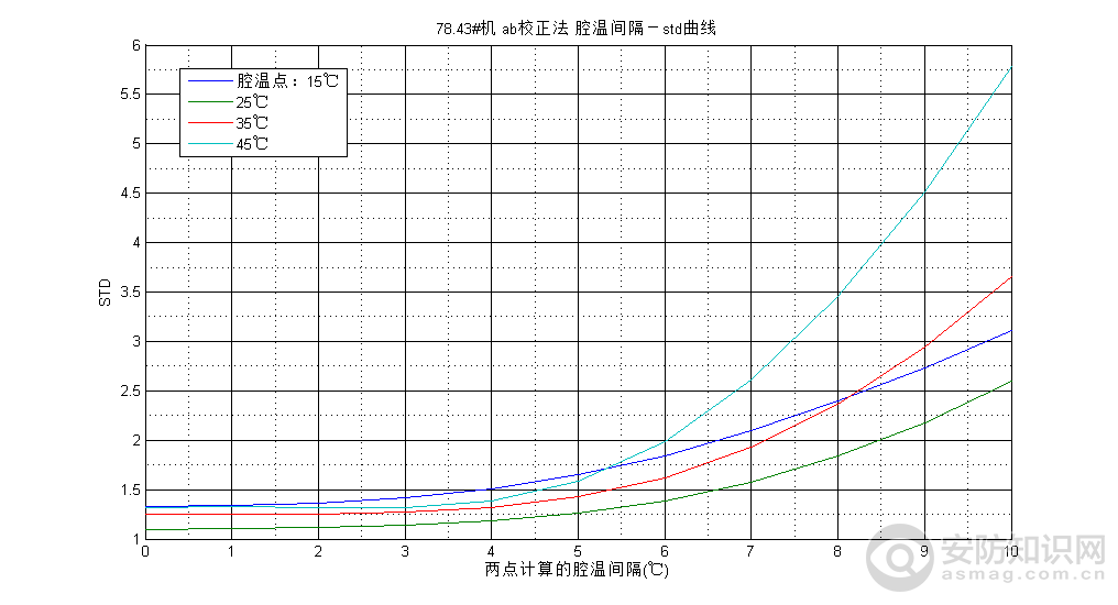 图3:在不同的前腔温度点,不同腔温间隔时的两点法校正结果的标准差曲线算法在传统的两点法的基础上,需要按一定的规则(如目前通常采用的前腔室温度差,或者更武断的按时间间隔)首先计算校正系数,因此其计算量比传统的一点法和两点法都要大。