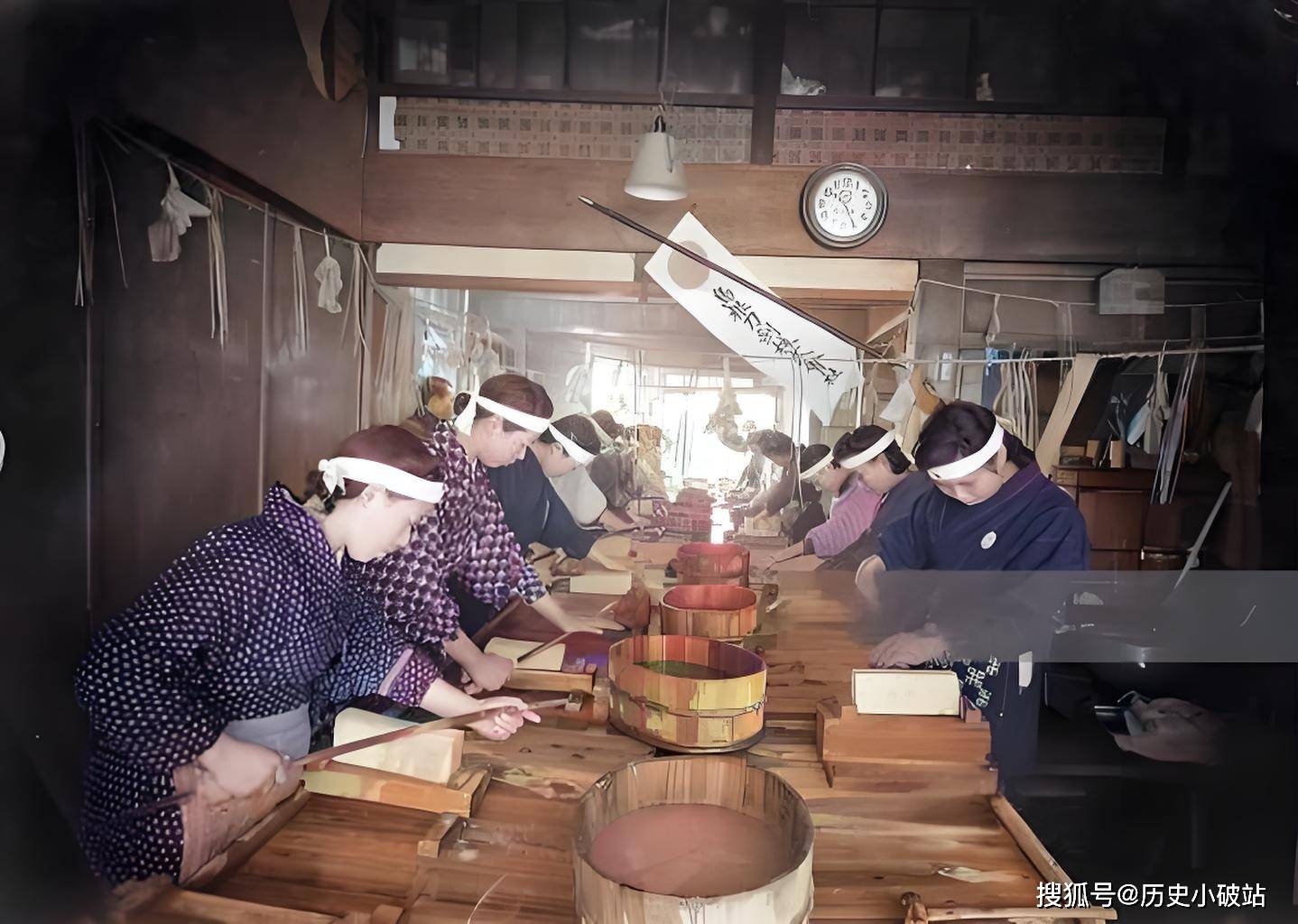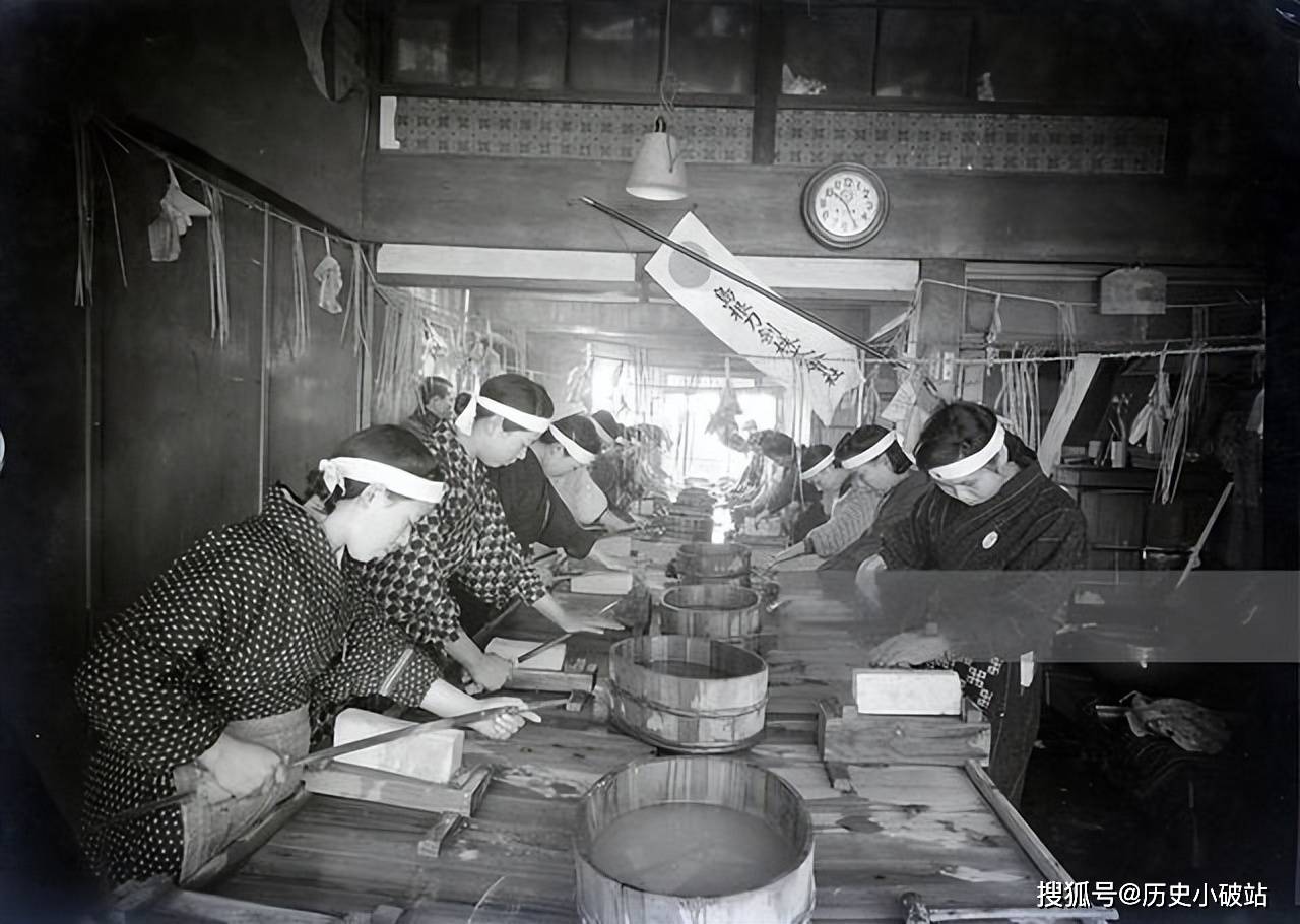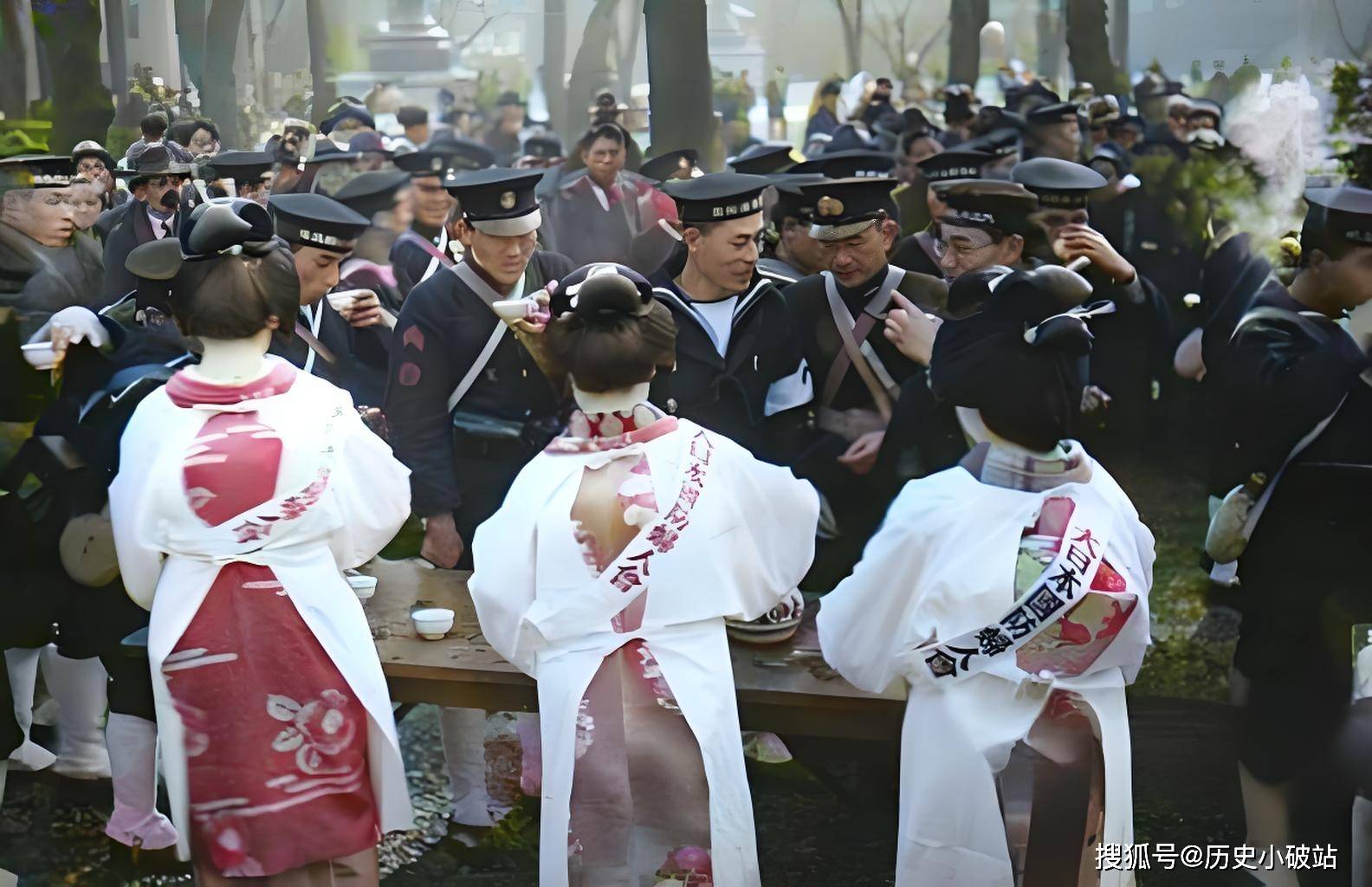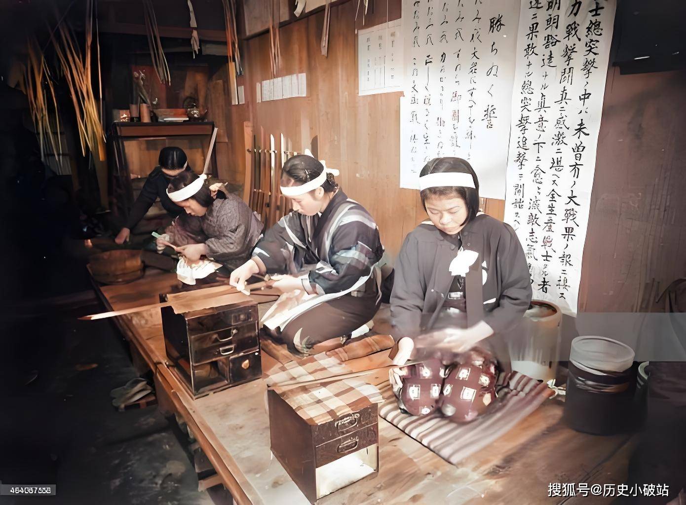 1943年5月27日“海军纪念日”,东京,18名身着振袖和服系着围裙的艺妓,正在捏饭团,这些“军国美少女”的服务,是日本海军省精心策划的“海魂振兴运动”一环。
