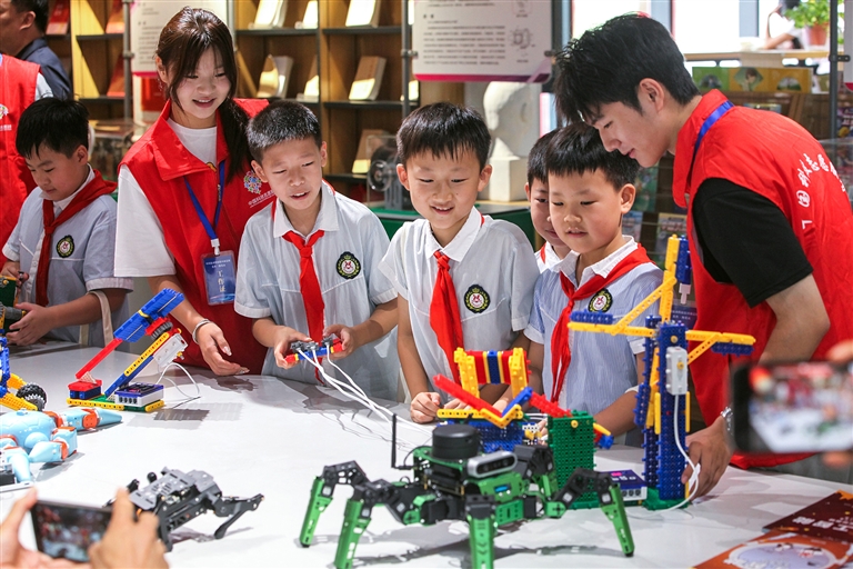 在河南省科技馆担任科技辅导员的姜丽佳从事机器人编程教学工作,在此之前,她曾长期在北京一所学校担任科学老师。姜丽佳告诉记者,一个新的展示课程往往需要2~3个科技辅导员为一组研发,并经过多轮的修正审核直至课程成熟,这个过程长达一个多月。“科技馆能接触更多数量和不同年龄段的孩子。在这里,我见证了孩子们从好奇到热爱、从模仿到创造的成长历程。”她说。